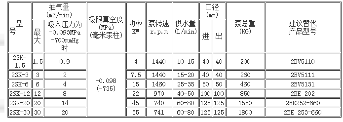 SK系列水環真空泵只能達到-700mmHg的極限真空度,為達到較高真空及高真空下的較大抽氣速率,20世紀80年代國內開發了2SK系列真空泵